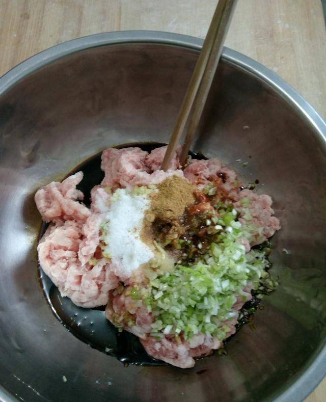 2、肉餡是買的現成的,把切碎的蔥和薑放入到肉餡裡面去。然後在餡兒裡面加入老抽,生抽,蠔油,鹽,十三香和香油混合均勻一下。