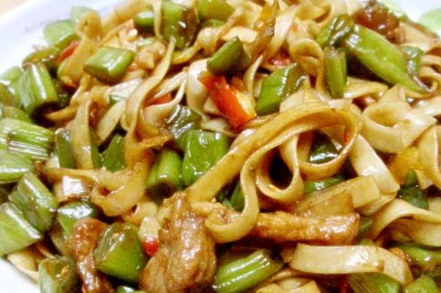 做法:洗凈青椒、四季豆,準備堿面,將四季豆斜切,青椒去籽切絲,面條入沸水,加少許鹽稍煮,面條稍斷生後立即撈出,放入冷水中,熱油鍋,放少許豆豉與花椒爆香,下四季豆與青椒快速煸炒,放入適量食鹽,炒熟後盛出,鍋中放少許食油,放入瀝幹水的面條翻炒,加少許拌飯醬,加一點開水,放入炒好的四季豆與青椒,翻炒均勻後出鍋