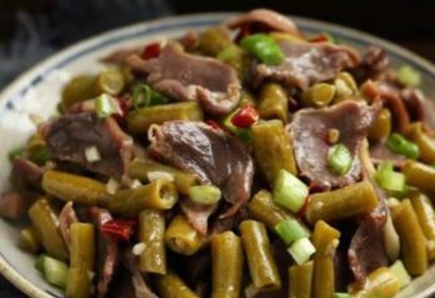 酸豆角炒鴨胗材料:鴨胗400克,酸豆角100克,大蒜2瓣,泡薑1塊,蔥花5克,鹽少許,白酒2茶匙,鹽適量,雞精1/3茶匙,油適量
