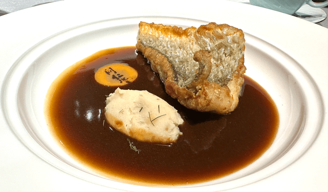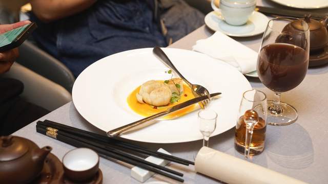 中醫傳統認為白則入肺,紅入心經,黃益脾胃,蘭州百合與澳洲帶子中西合璧,百合的甘甜綿密與澳帶的彈嫩交映生輝,過火慢焗配以藏紅花和南瓜蓉醬汁,鮮香甜潤,色澤清透柔和,是盛夏之際的溫補佳品。