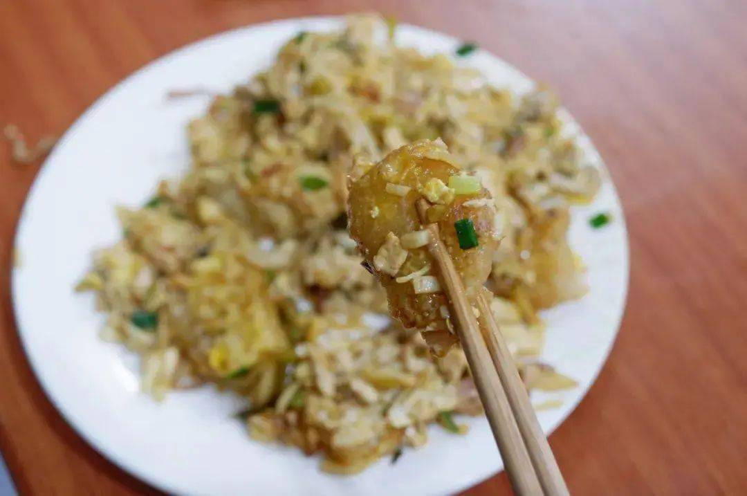 廚師將麻糍、精瘦肉絲放在平底烙盤上,翻炒至兩面變成焦黃色,中途澆蛋液進去,再加入豆腐幹、蔥段、菌菇、咸菜等,以油代水,看火候淋入調味料。