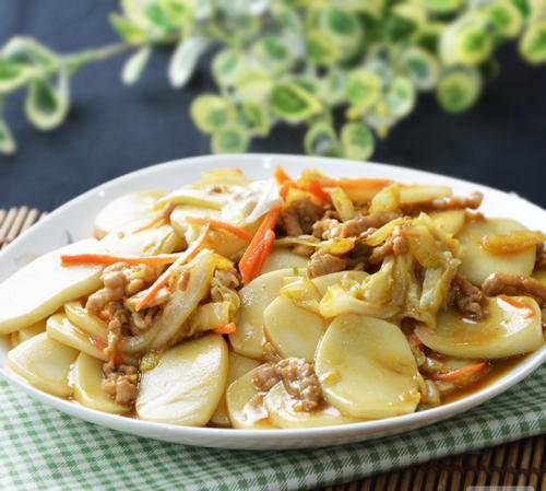 4、最後加入焯水好的年糕翻炒均勻即可。