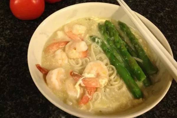 5、再加兩次冷水讓面煮熟。然後放入蘆筍
