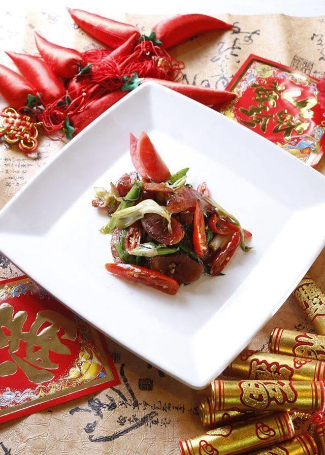 同油鍋,蒜苗、辣椒與蒜仁下鍋爆香後,放入香腸、米酒、醬油、糖、少許水快速翻炒,起鍋前淋上香油即可上桌。