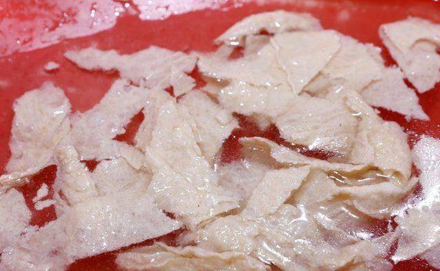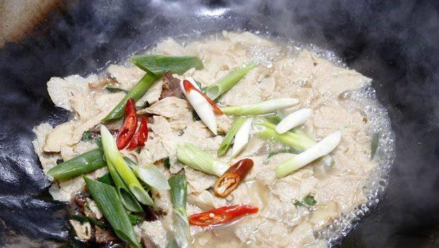 起油鍋放進臘肉薄片翻炒,再加進腐皮、薑片、辣椒、豆豉醬、蠔油、糖、水1大匙、胡椒粉翻拌均勻。