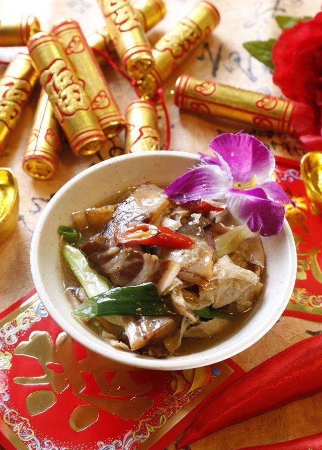 臘肉洗凈後,加入薑片與少許切段蒜苗蒸約30分鐘,切薄片備用。