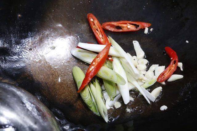 蒜苗斜切段、辣椒斜切片、蒜仁拍扁後切片。