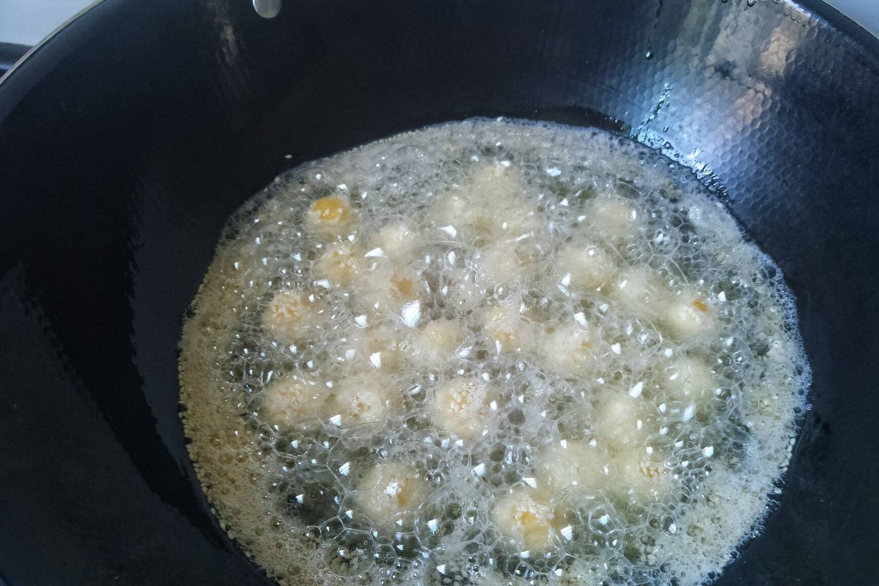 4、鍋內倒入小半鍋油,燒到六分熱後,將做好的開口笑放入鍋內,小火進行油炸,油炸到開口笑變金黃,表面裂開,即可熄火控油撈出