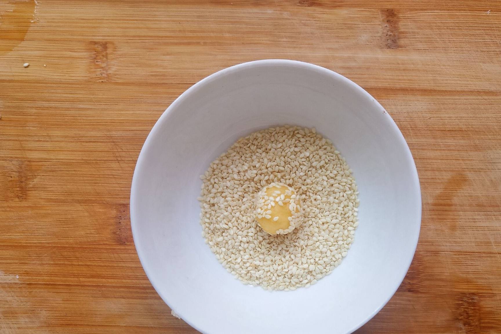 3、混合好後,我們取一小塊面團搓成圓球,放在白芝麻裡滾一圈!剩下的面團也依次操作