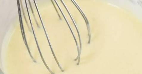 將一袋牛奶放入鍋裡,微開就可以啦,倒入打好的蛋黃中,邊倒邊攪拌。