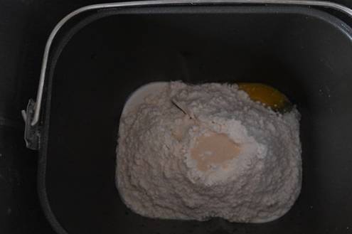 材料如下:高粉250g、雞蛋1個、淡奶油80g、糖45g、鹽2g、水45g、黃油14g、酵母3g