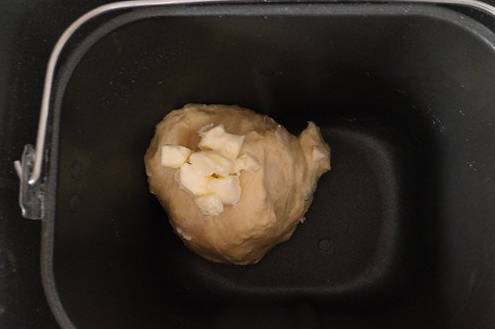 2、15分鐘結束後,加入軟化的黃油,繼續選擇和面按鈕,時間為15到20分鐘