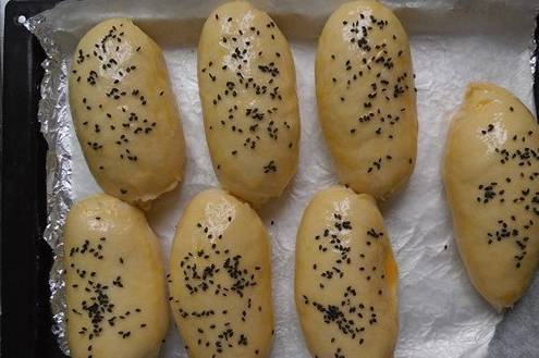 8、發酵到1.5或2倍大即可,發酵好的熱狗胚,我們再表面刷上一層黃油液,然後再撒上適量的黑芝麻,送入預熱好的烤箱,上下火162度,烤18分鐘左右,溫度僅供參考