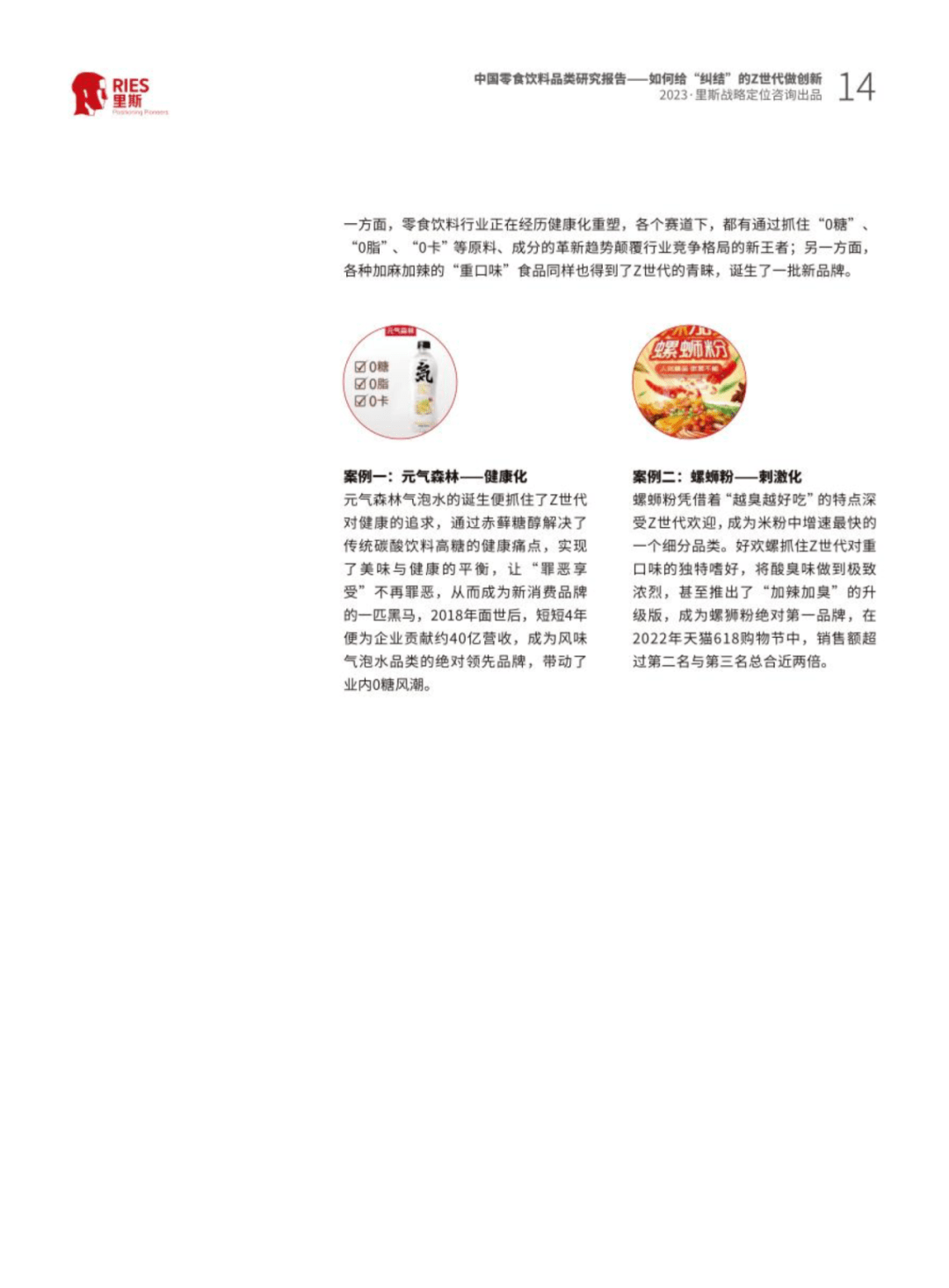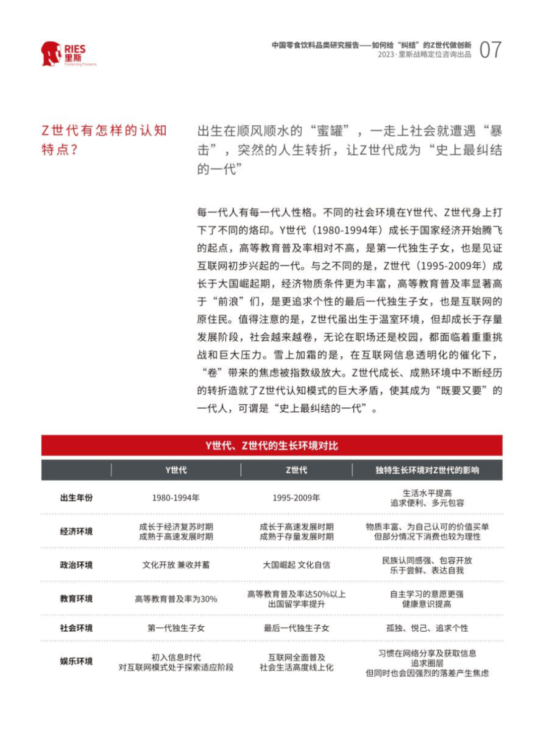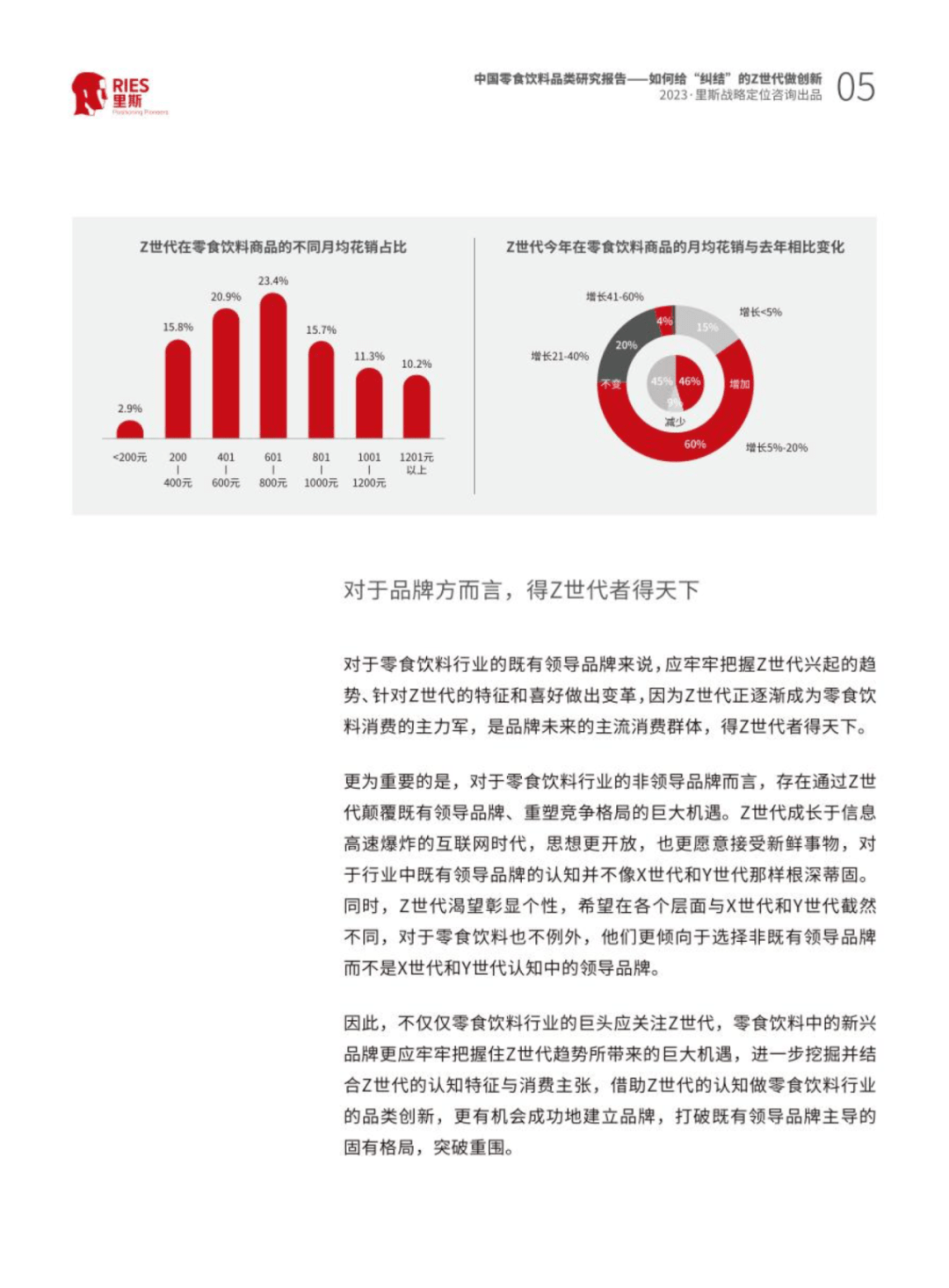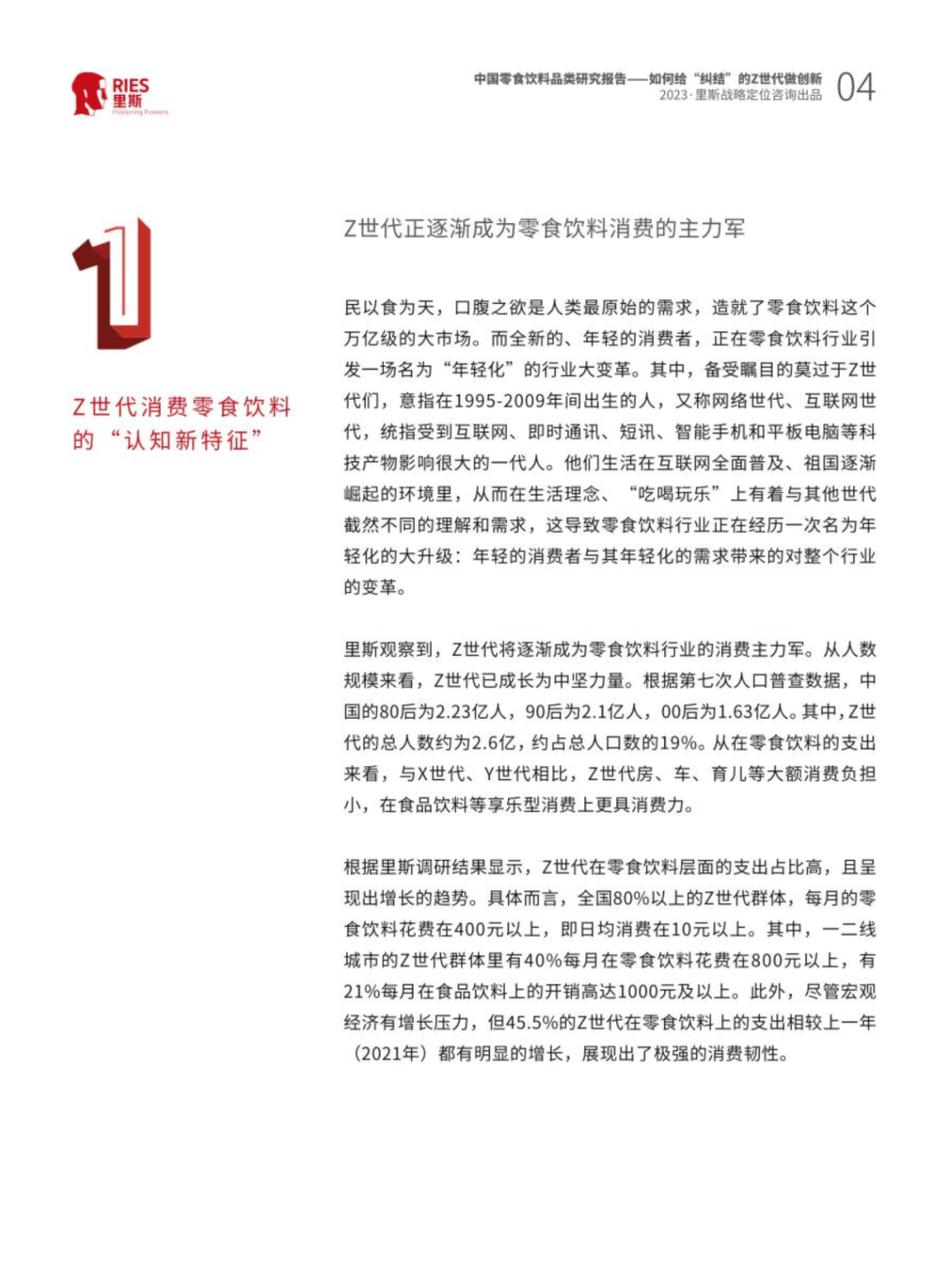 裡斯觀察到,Z世代將逐漸成為零食飲料行業的消費主力軍。從人數規模來看,Z世代已成長為中堅力量。根據第七次人口普查數據,中國的80後為2.23億人,90後為2.1億人,00後為1.63億人。其中,Z世代的總人數約為2.6億,約占總人口數的19%。從在零食飲料的支出來看,與x世代、Y世代相比,Z世代房、車、育兒等大額消費負擔