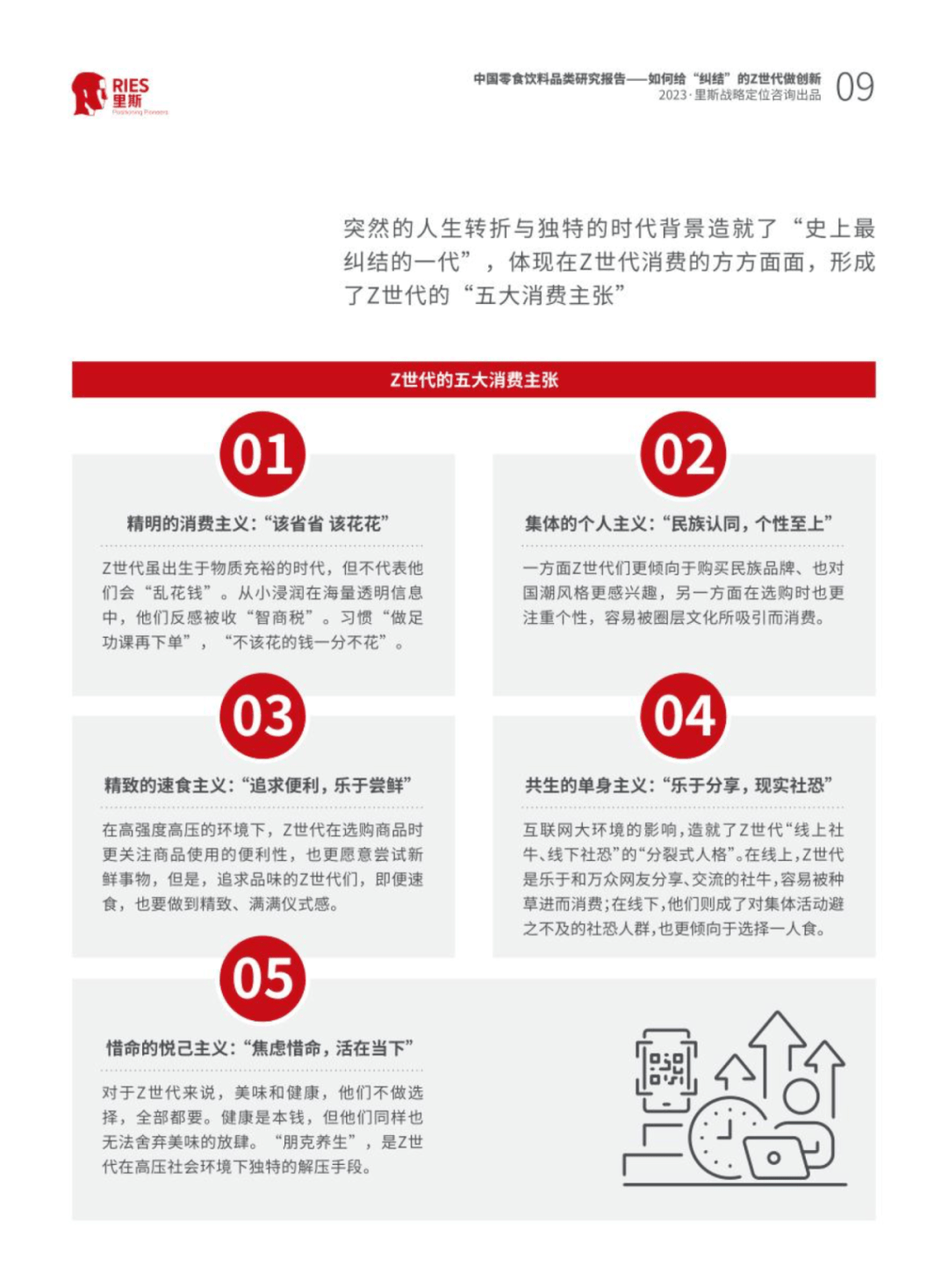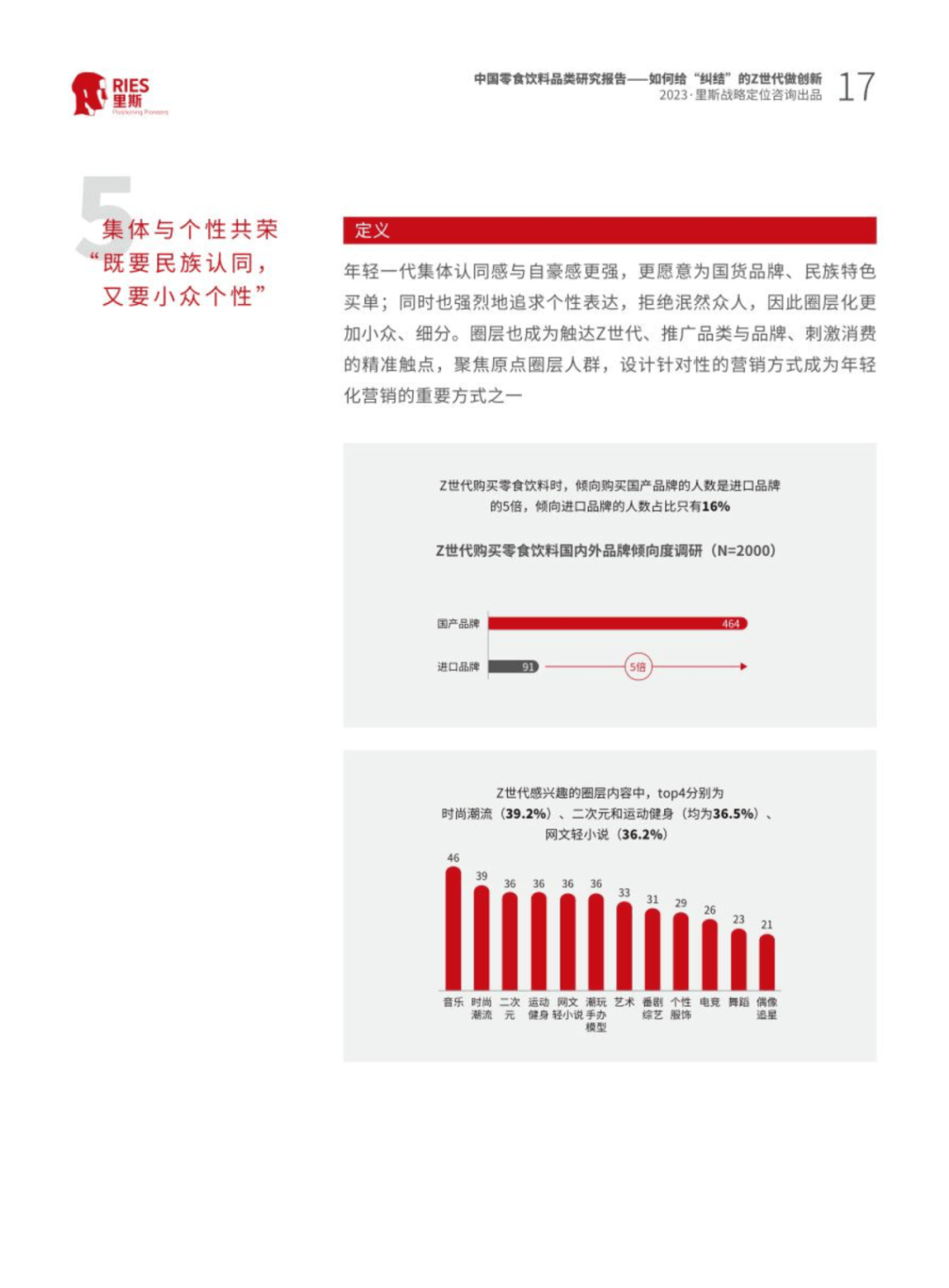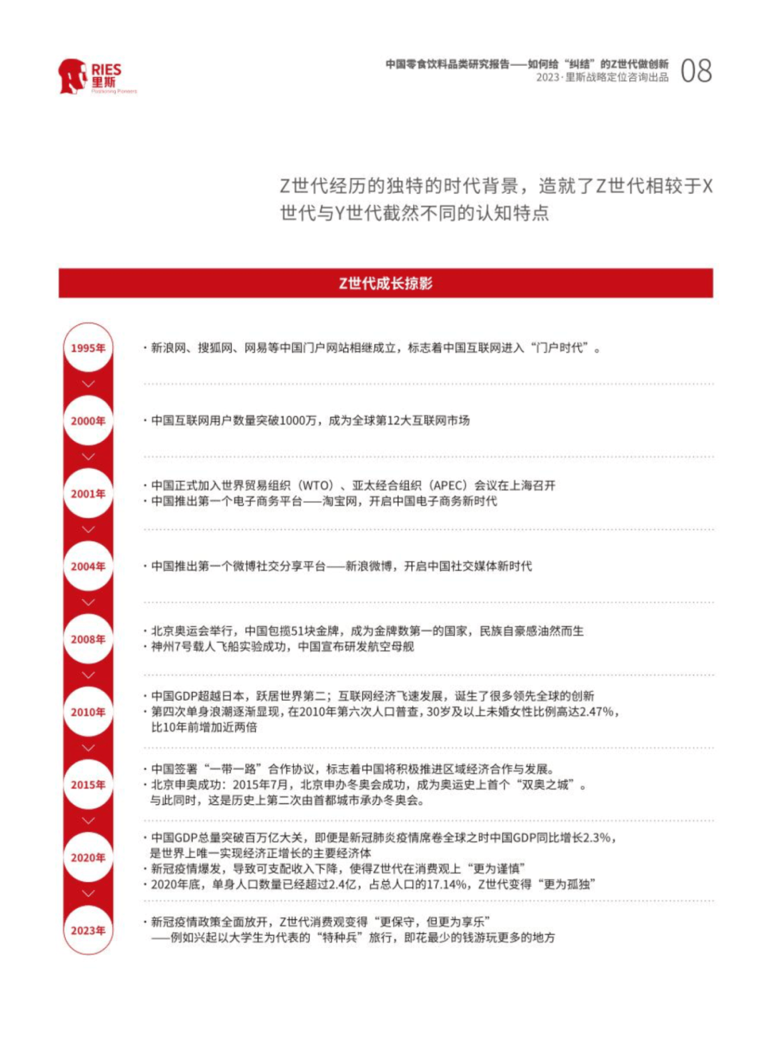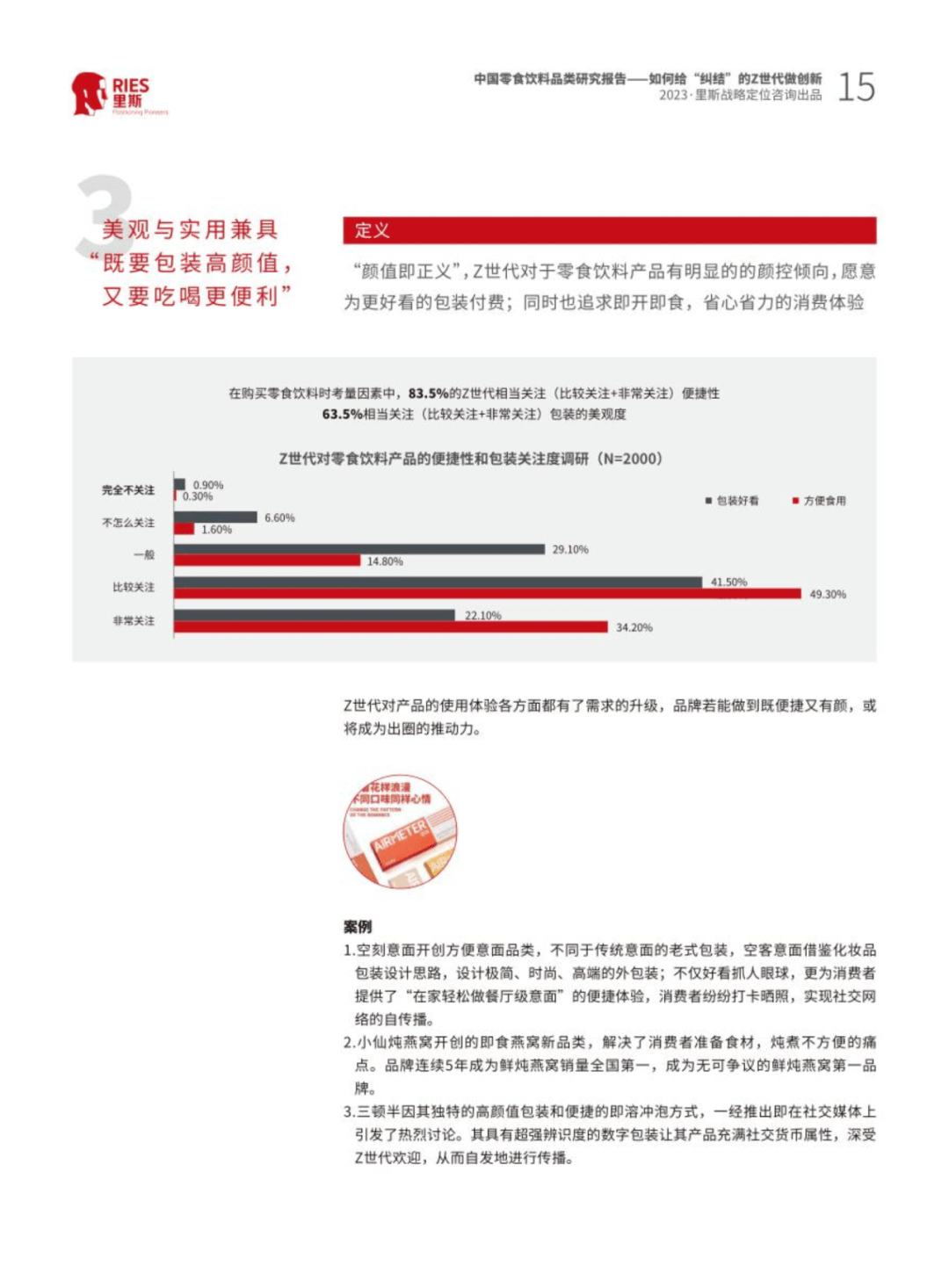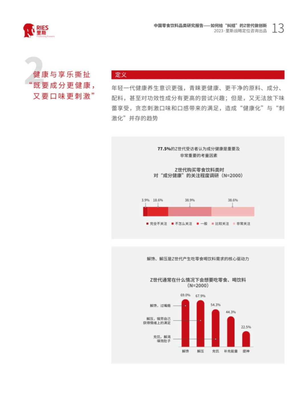 裡斯觀察到,Z世代將逐漸成為零食飲料行業的消費主力軍。從人數規模來看,Z世代已成長為中堅力量。根據第七次人口普查數據,中國的80後為2.23億人,90後為2.1億人,00後為1.63億人。其中,Z世代的總人數約為2.6億,約占總人口數的19%。從在零食飲料的支出來看,與x世代、Y世代相比,Z世代房、車、育兒等大額消費負擔