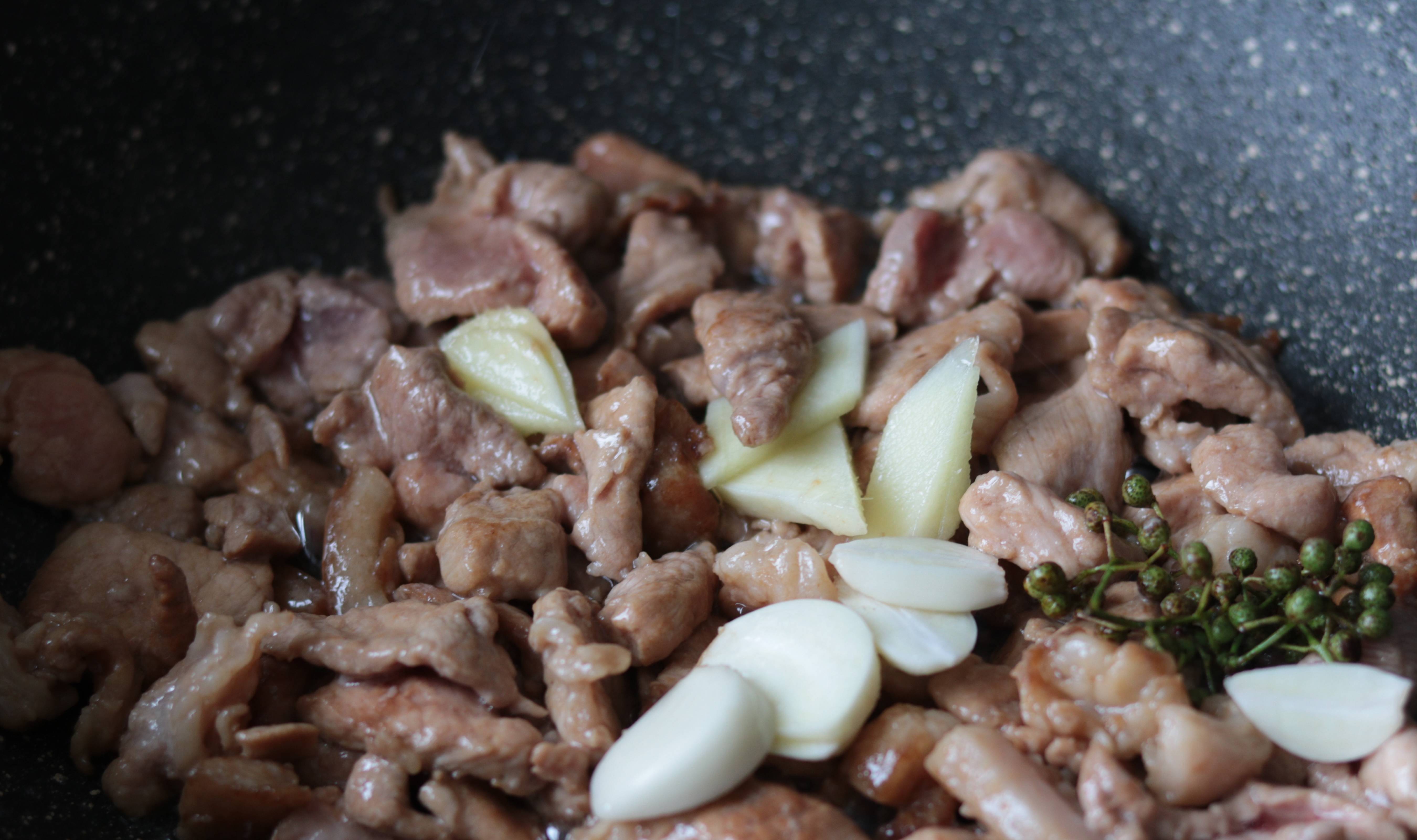 8、翻炒變色後,加入鮮花椒、蒜片、薑片,炒出香味。