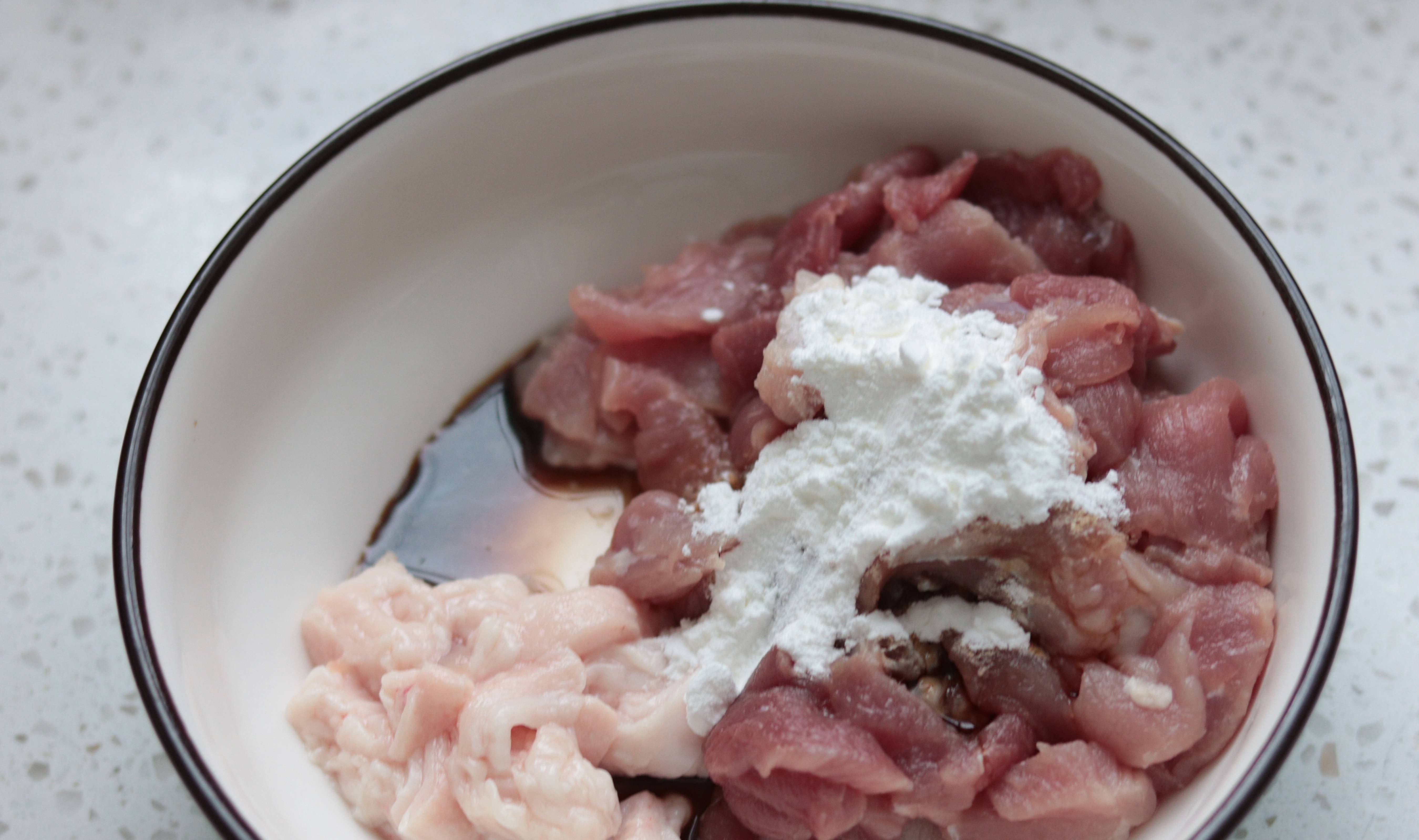 3、豬肉切成片,加入生抽、料酒、淀粉。