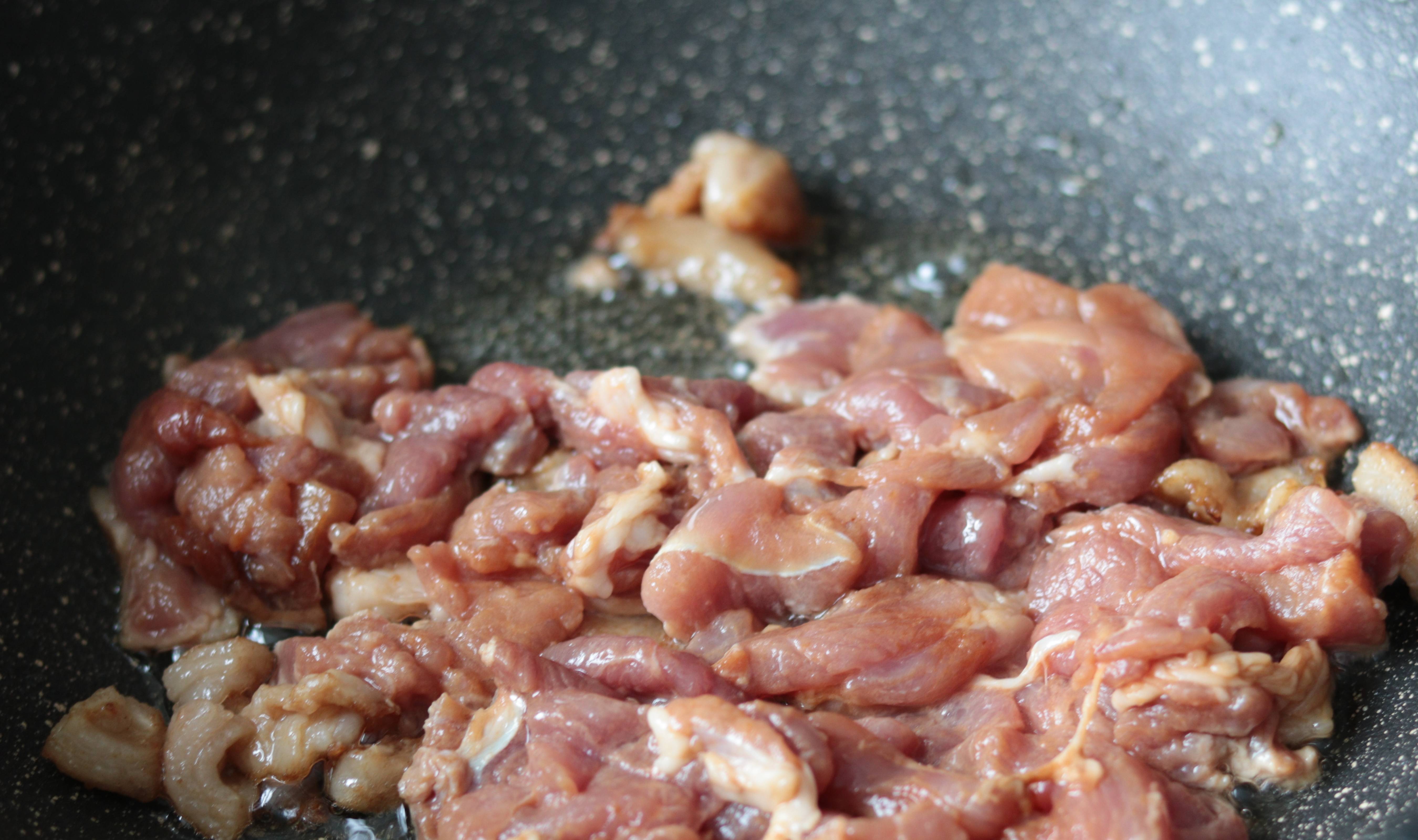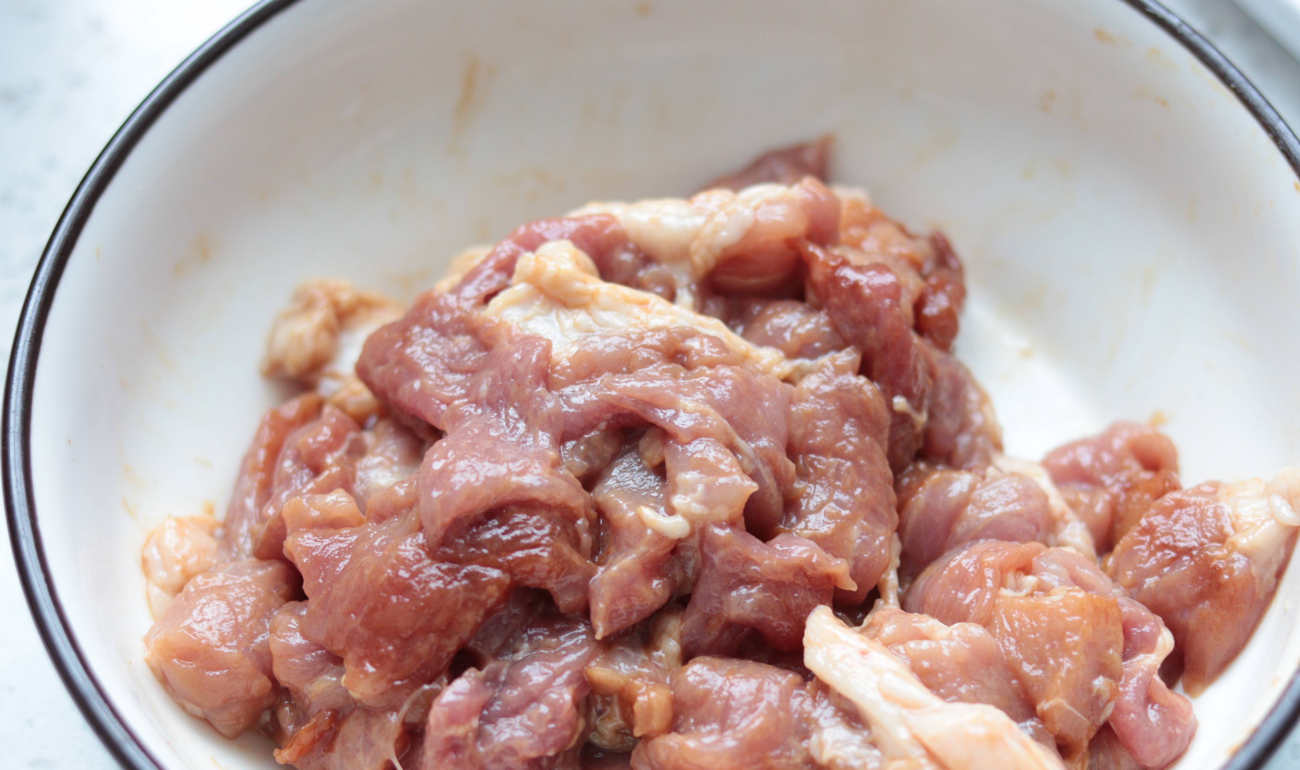 7、熱鍋溫油,下入醃漬好的豬肉片。
