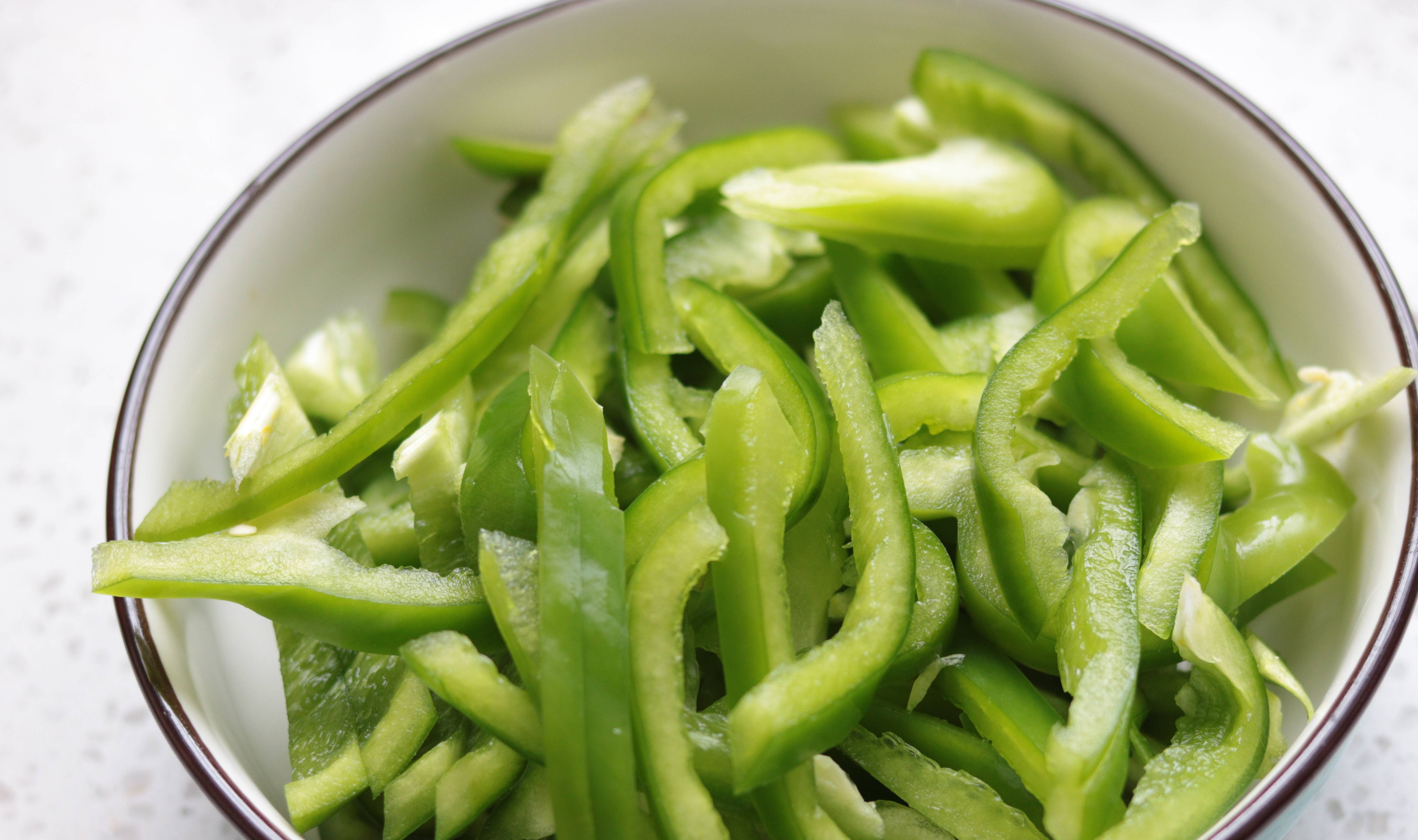 5、甜椒去掉蒂和辣椒籽,切成細條,裝盤備用。