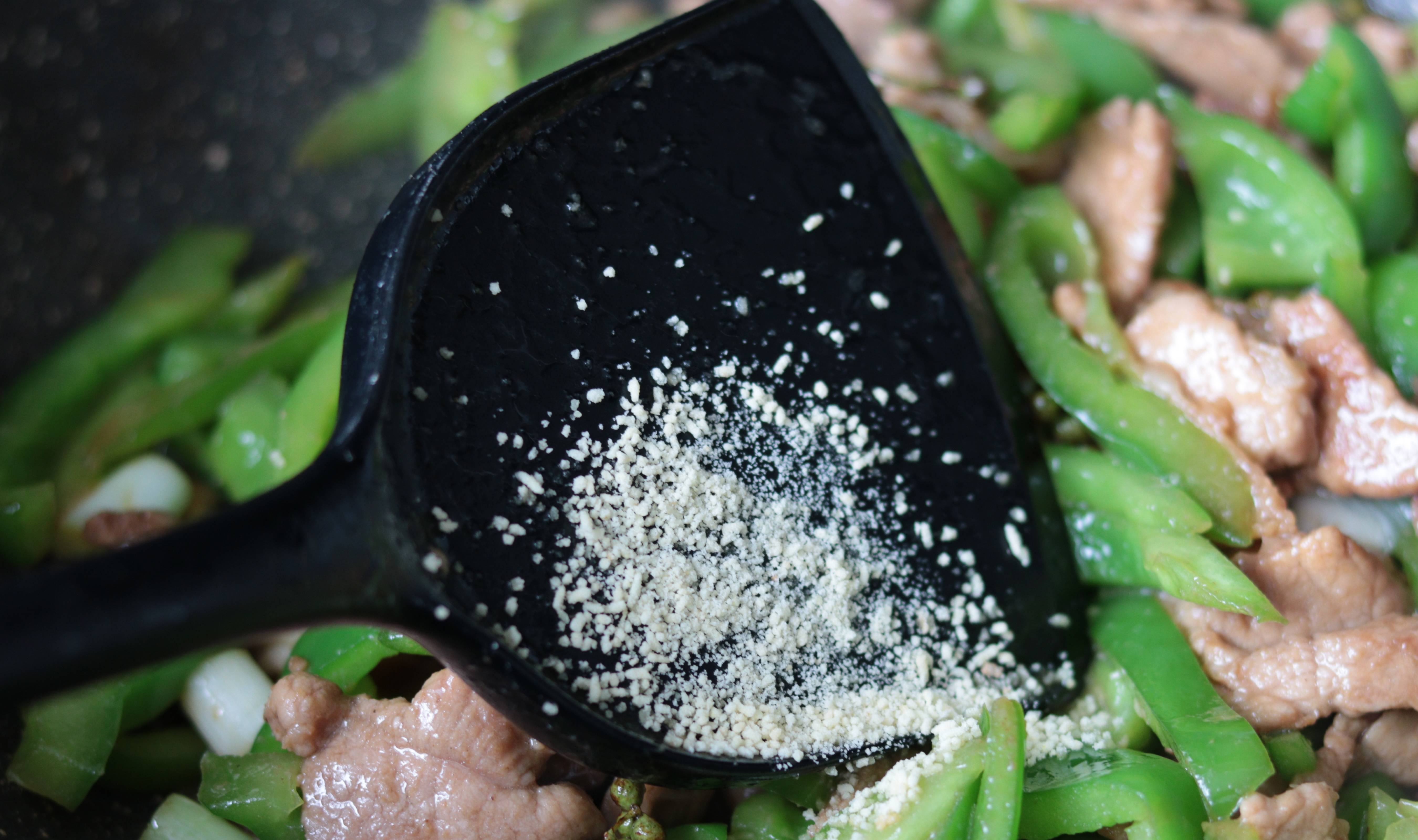 12、加入少許雞精,拌勻調味,因為生抽和大醬裡都有鹽我們就不用放鹽瞭。