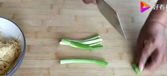 然後我們再切上一把小蔥把它切蔥花。和切好的土豆放在一起,接下來我們根據這個土豆的水分多少分次加入適量的淀粉,把它攪拌均勻像這樣的濃度就差不多瞭。