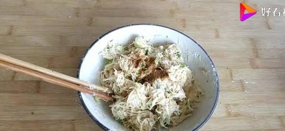 接下來我們加入適量的花椒粉十三香鹽,用筷子把它攪拌均勻我們就可以上鍋烙瞭。