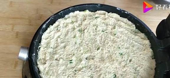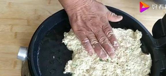 起鍋開中火鍋中放適量的油,然後我們放入準備好的土豆絲用手調整一下,把它調整成厚薄均勻的圓形面餅。