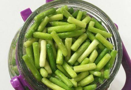 3.醃制蒜苔。將香料與蒜苔混合後,浸泡非常重要。最好在冰箱裡醃制一夜。香料與蒜苔完美融合,更加酥脆可口。