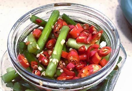 第五步,可以把隔夜醃好的蒜苔撈出來,特別香脆可口,配上一些辣小米就可以享用瞭。