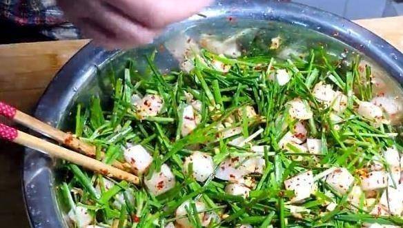 3、再準備大蒜50克,韭菜300克,生薑30克。我們不把大蒜去皮切成蒜片。生薑洗凈後切片,韭菜洗凈切片。