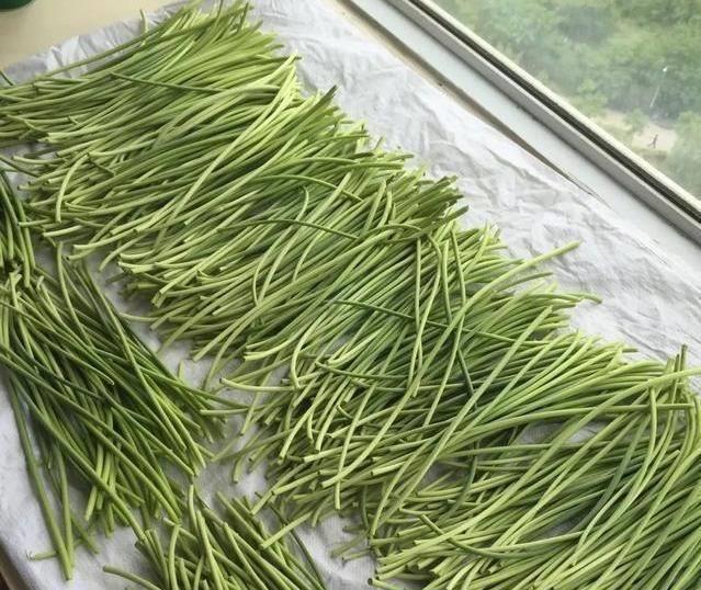 步驟1。在菜市場買2到3片嫩到能擠出水分的蒜苔,洗凈,切掉頭尾,放在陰涼通風處晾幹!