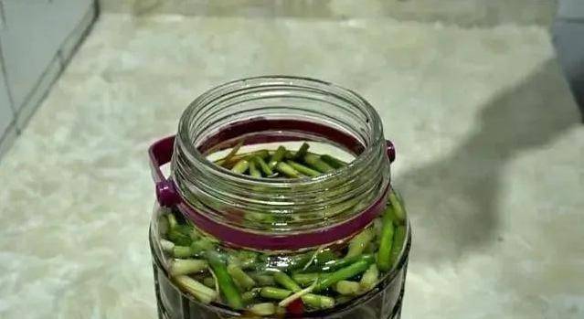 第五步:準備一個幹凈的無水無油的玻璃瓶,將粘附的蒜苔放入瓶中,用白酒封口,置陰涼處封口24小時左右即可食用!