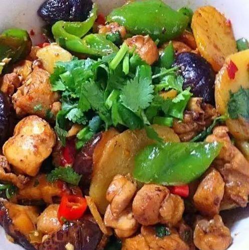 雞腿洗凈,切塊,泡在碗裡去血水。然後瀝幹水分,加入少許鹽、胡椒粉、生抽和料酒醃制15分鐘。利用雞大腿醃制的時間切碎配料,將任意大小的香菇切成兩半,將土豆、青椒和紅椒、生薑、大蒜和歐芹去皮切片。鍋內放油,先將土豆片炸至半熟,備用。鍋內放油燒熱,將醃制好的雞腿倒入鍋中。翻炒變色。加入香料、肉桂、八角和胡椒粉,炒香。然後加入蔥薑蒜一起炒。最多炒8分鐘,然後加入一勺豆瓣醬翻炒入味,半勺油,一勺生抽,一勺豆豉。然後放入香菇炒,再放入土豆繼續翻炒。這時候加一點肉湯或者開水加一點。最後放入青紅椒炒熟。等辣椒快熟瞭,加入一勺雞精翻炒起鍋。中間放一些歐芹,裝飾一下。這幹鍋燒雞做得好。