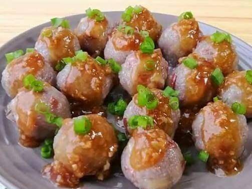 6.20分鐘後取出丸子。將新鮮調制的醬汁倒在肉丸上。撒上一些蔥花裝飾一下就完成瞭。(如果喜歡吃辣的,也方便,加一點辣椒醬。)
