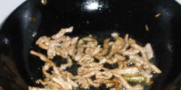 3.起鍋燒油,等到油溫七八成熱的時候,把大蒜快速放入裡面翻炒爆香,然後把肉絲倒入鍋中。