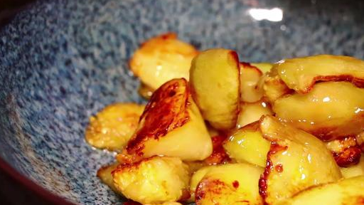 接著鍋中加油,油熱之後放入花椒炸香,將花椒撈出棄之不用。接著放入茄子。煸炒茄子的過程,首先是茄子先吸油,然後再炒至茄子中的油逼出來。盛盤備用。