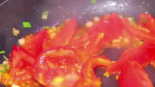 在鍋中放入蔥,薑末。先炒出香味兒,放入番茄炒出湯汁。西紅柿斷生之後加入一點生抽,加入一點老抽。一小勺白糖繼續煸炒。接著放入處理好的茄子,讓番茄的湯汁均勻的裹在茄子上面。最後淋入入一點水芡粉。湯汁濃稠我們就可以出鍋盛盤。