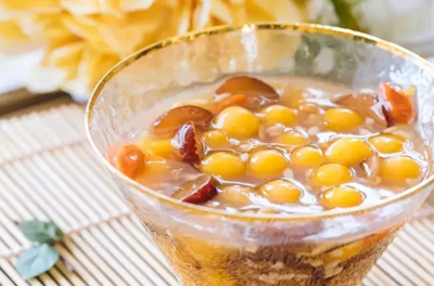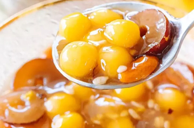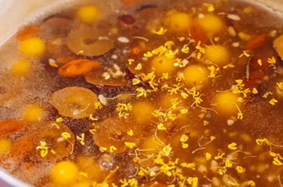 接著放入紅糖、酒釀和枸杞,攪拌均勻。將生粉水攪拌均勻,分2—3次加入到鍋裡面,充分的攪拌均勻再加下一次。最後撒上少許的幹桂花,就可以出鍋瞭。