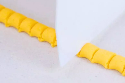 將蒸好的南瓜取出來,放入稱好的糯米粉,用手將其混合均勻,揉成光滑的面團。取一小塊面團放到面板上,搓成直徑約0.5厘米左右的長條。用刮刀將其切成大小均勻的小塊,用手搓圓。