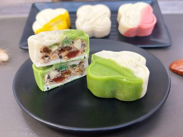為瞭讓月餅更有文化味,在保留傳統制作工藝的基礎上,今年,李璐開始采用晉祠大米米粉制作帶有聞名遐邇的太原地標元素的“爐食人人馬馬”。為瞭保證月餅烘烤後不變形,在餅皮用料配比上李璐也費瞭一番心思。功夫不負有心人,經過反復試制,最終李璐摸索出晉祠大米、白玉米和白蕓豆的獨傢用料配比。同時,再把菠菜、南瓜、玫瑰、紫薯等榨成汁,調配成純天然顏料活入面中,不同顏色的面團揉在一起,包入大大一團由巴旦木、腰果、南瓜仁、冬瓜丁、花生、瓜子等配成的餡料,放入刻有太原地標元素的模具中,按壓、脫模,一個個印有太山龍泉寺、晉祠聖母殿、太原古縣城等造型的套色米月餅就成型瞭。烤制後酥而不松、甜而不膩,酥糯精致,香甜可口,回味無窮。