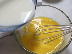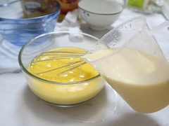 蛋液中,加入步驟2的牛奶液體,一邊加一邊均勻攪拌。