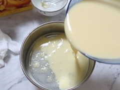 倒入淡奶油及煉乳,混合均勻。