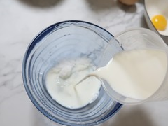 將牛奶和細砂糖倒入碗中,用手動打蛋器,均勻攪拌,約一分鐘左右,將白糖完全融化。
