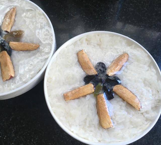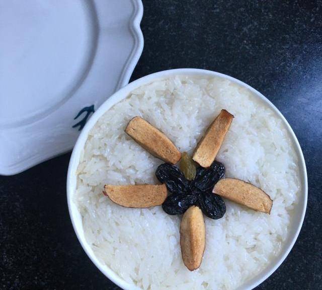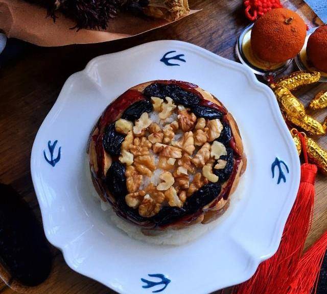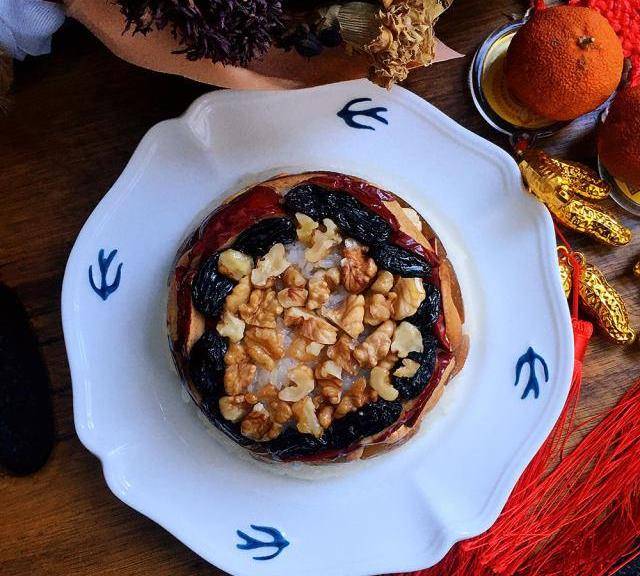 原料:糯米、黑加侖、紅棗、核桃仁、葡萄幹、腰果、水。