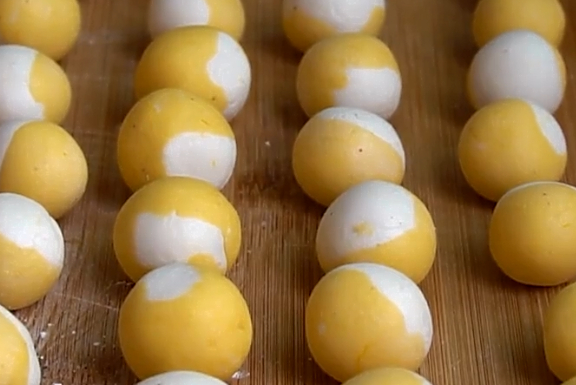 第四步:將白色面團和黃色面團都放在案板上不用醒面不用揉面,直接搓成長條,分成同等數量的面劑,然後各取一個面劑用手都揉一下,把它們搓成長條(大約和手指頭那麼寬的長條就可以瞭),將兩個面劑都對齊,用刀再分成小面劑,取一個粘連在一起的面劑將它先用手捏一下,然後團成圓球,全部最好之後放在一旁備用。