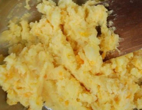 然後我們將紅薯蒸好,之後趁熱放在幹凈的盆子當中搗碎。搗碎的時候大傢可以放上適量的白砂糖,不用太多,然後再加上一些面粉,再磕入兩個雞蛋和一袋子牛奶,面粉的量根據盆中的紅薯糊濃稠度來決定,如果過稀,就多加一些面粉。