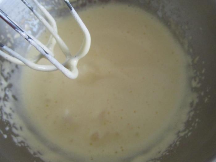 第三步:把打發的蛋液中加入牛奶和玉米油拌勻。