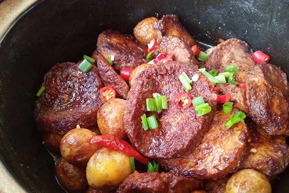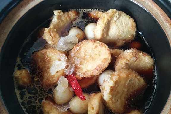 4、炸好的素雞和鵪鶉蛋一併放入砂鍋中,再淋入一勺生抽、一勺醬油、放入一塊老薑、20克冰糖、一粒八角、兩根幹辣椒和適量清水和食材齊平。