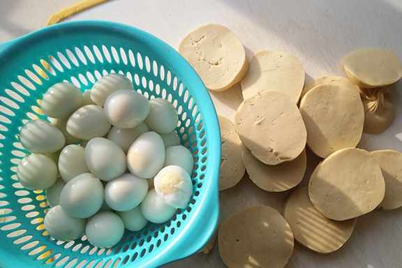 1、鵪鶉蛋冷水下入鍋中放入一片老薑,煮熟後剝去蛋殼備用,素雞切厚約一釐米的薄片備用。