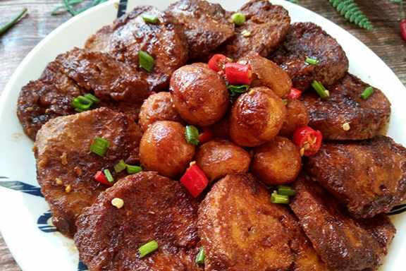 5、大火煮開鍋中食材,然後轉中小火賭煮至湯汁剩下一半,素雞和鵪鶉蛋上色後,撒上適量蔥花就就可以了。